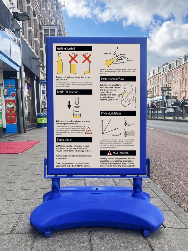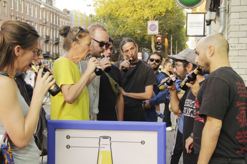 Can any object become a musical instrument? Even the most ordinary objects carry the potential for resonance. At a house party, a pan might turn into a drum, or a salt shaker into a maraca. And who hasn’t tried, with varying success, to whistle through a beer bottle? For reclame #9, primeira desordem invites you to master this skill. What may seem like a hobby, a pastime, or a playful exercise takes on new significance when practiced collectively: the act of learning, repeating, and playing together becomes a way of reclaiming time and attention. On the sidewalk, the sound of bottles will unfold as a poetic gesture, a gathering, a soft protest, and a temporary concert shared with those who join in.